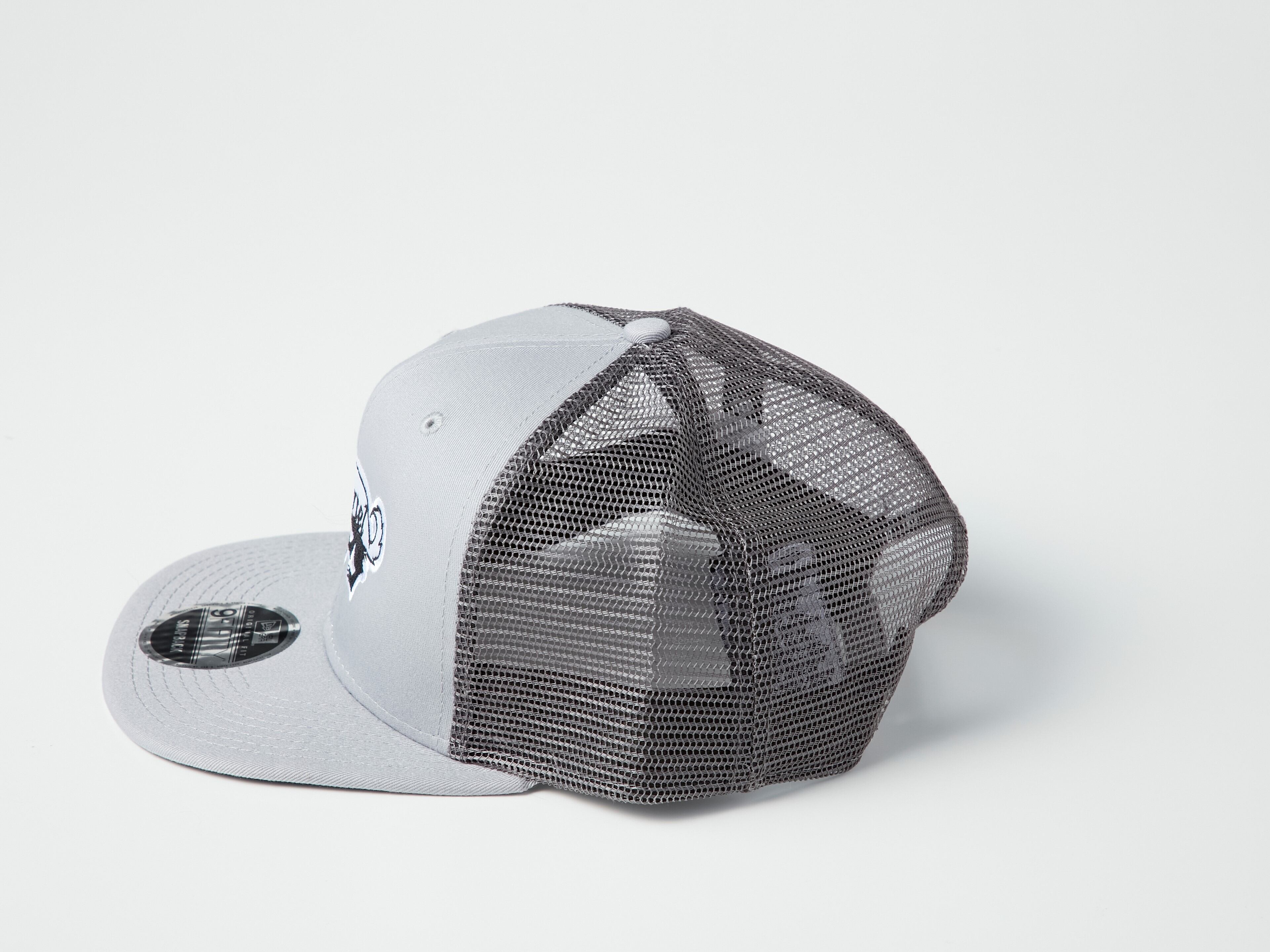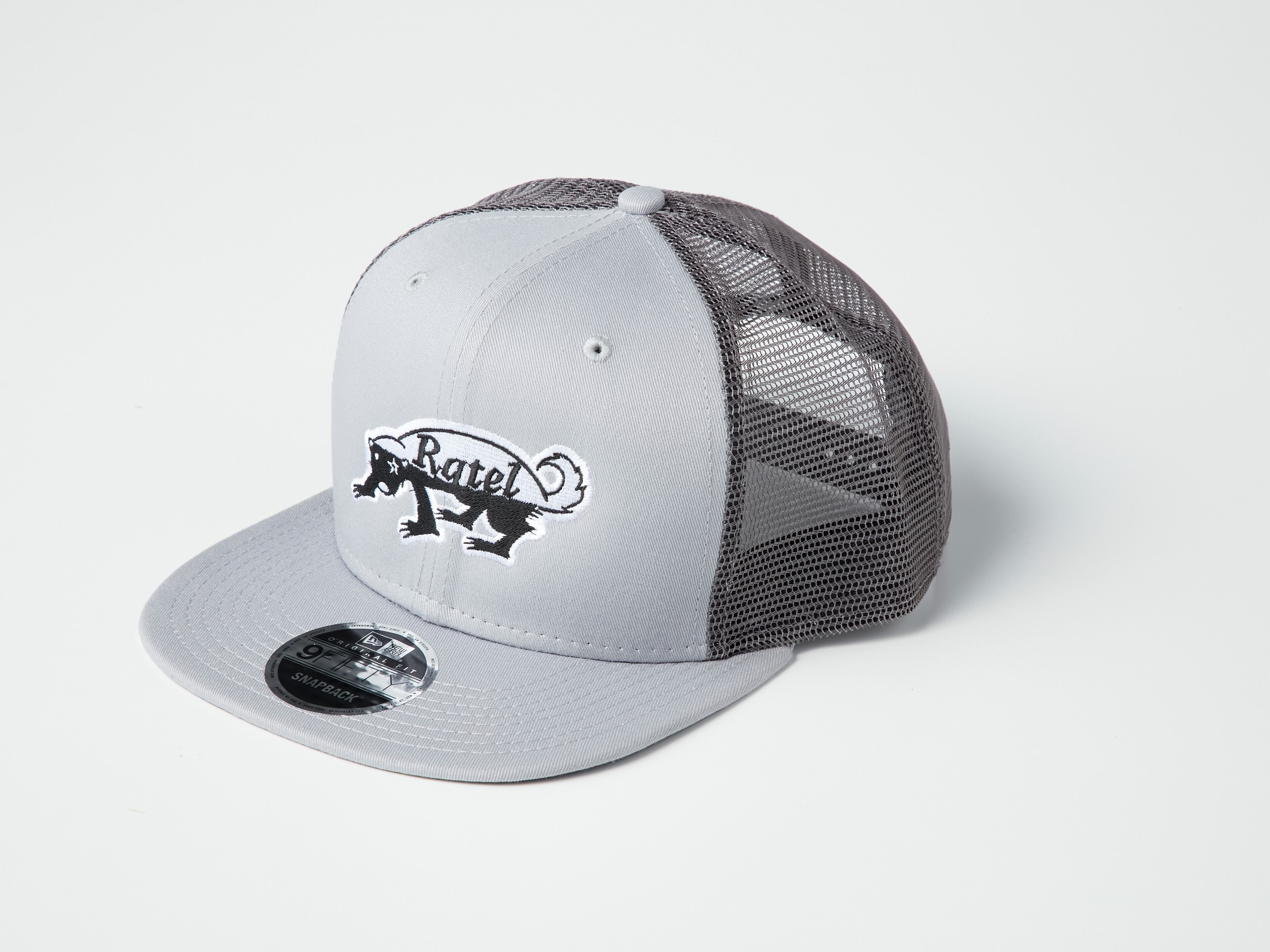 ライトグレーのコットンパネルにRATELのモノクロ刺繍ロゴ、ダークグレーのメッシュバック。
