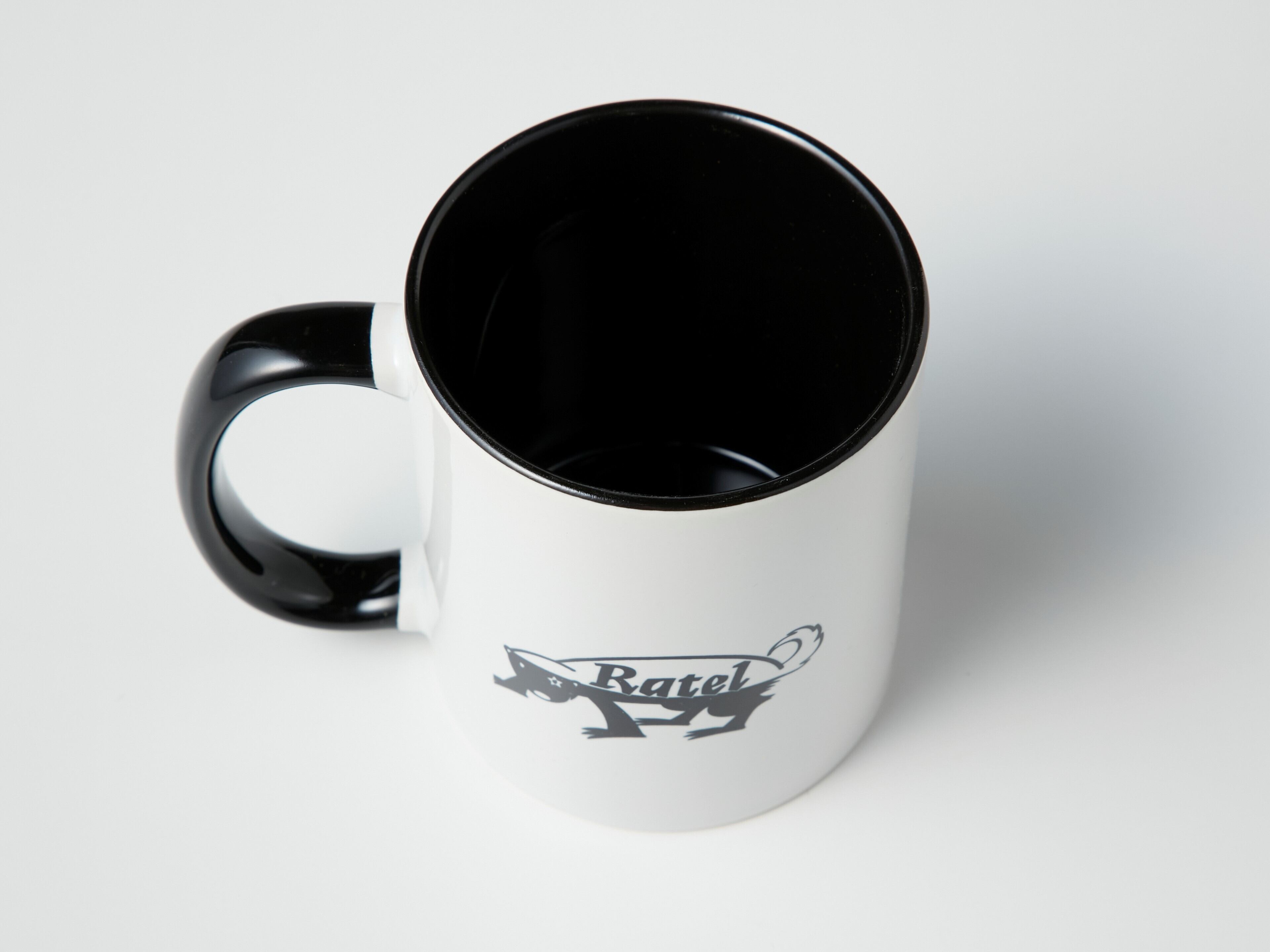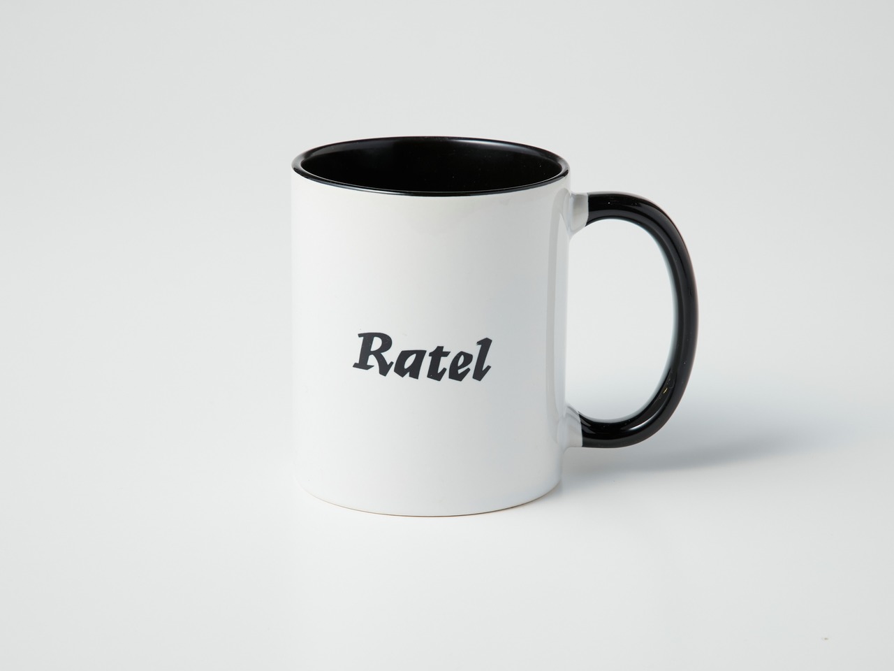 RATELのキャラクターとアルファベットロゴがプリントされたマグカップ。